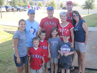 This weekend was SUPER busy! We had tickets to the Ranger/Rays playoff game on Saturday at 4pm so we left the house at 2pm (naturally:) to fight the traffic and "tailgate" (if you will:). *I come from Kansas City where we Chiefs fans really know how to tailgate so sitting in the back of my SUV eating peanut butter and jellies and chips out a bag just didn't do it for me...ha:) ~jk